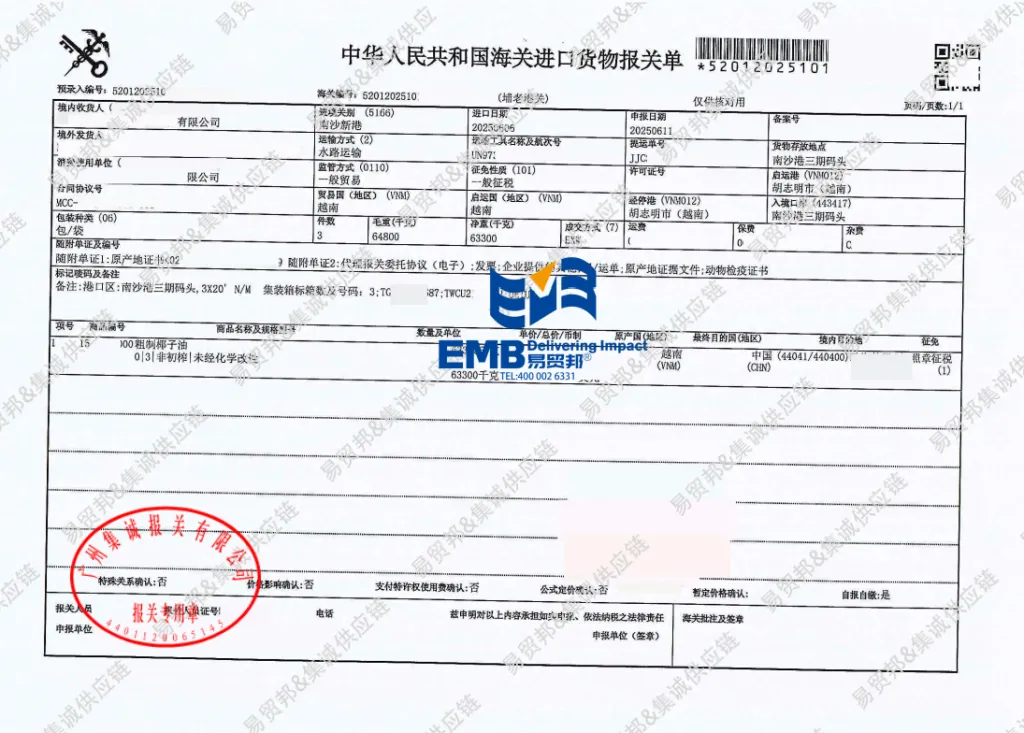 【进口案例】越南粗制椰子油广州南沙港进口报关运输案例-易贸邦&集诚供应链