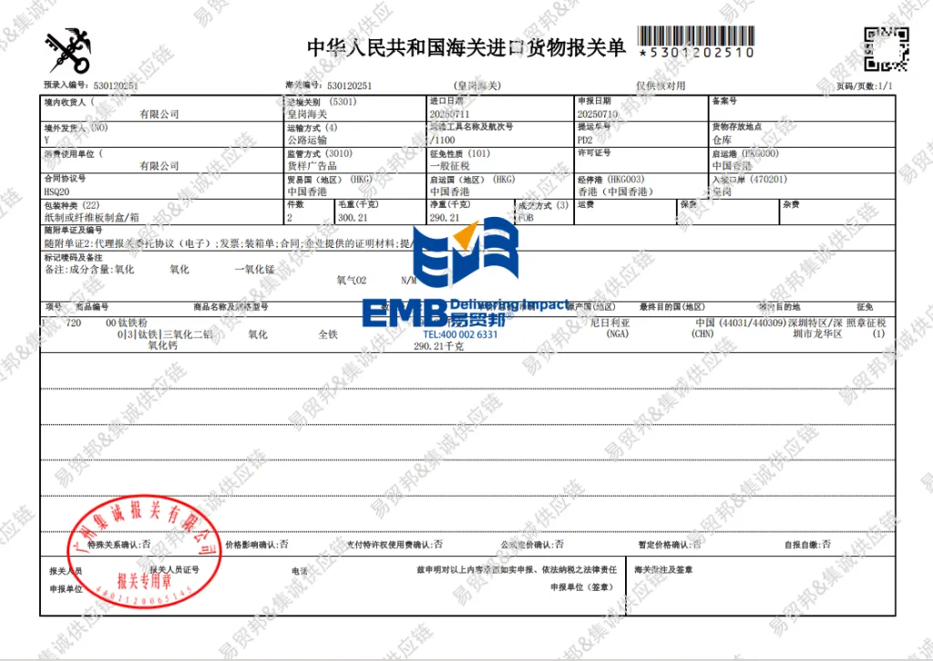 一、尼日利亚钛铁粉深圳皇岗口岸进口案例信息详情