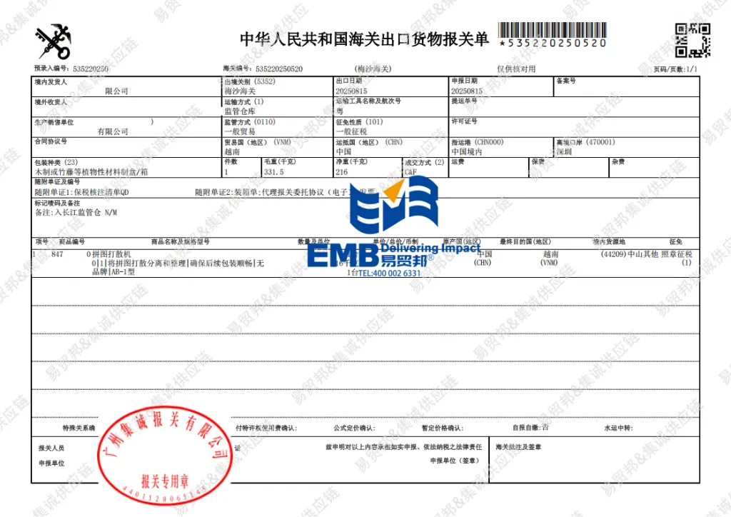 三、拼图打散机出口越南手续流程