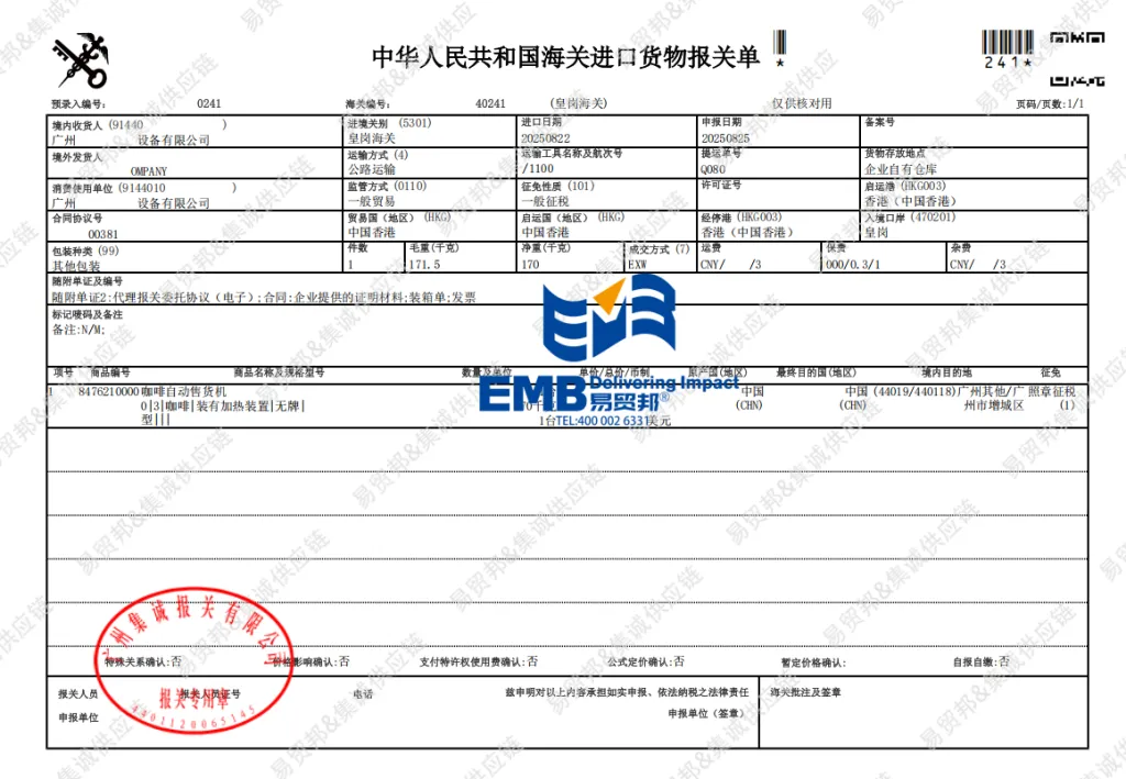 以上是我司咖啡自动售货机香港进口报关通关案例的全部内容,如您有自动售卖机、咖啡机、饮料机、烘烤机等机械设备的进口需求可私信联系我们或直接拨打400 002 6331咨询。