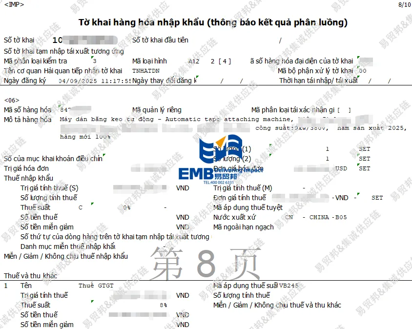 一、中国全自动贴带机出口越南报关运输案例信息详情