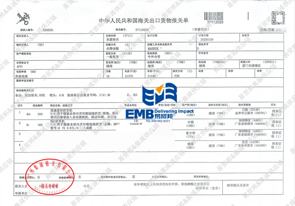 【出口案例】中国折页机出口越南门到门清关运输案例-易贸邦&集诚供应链