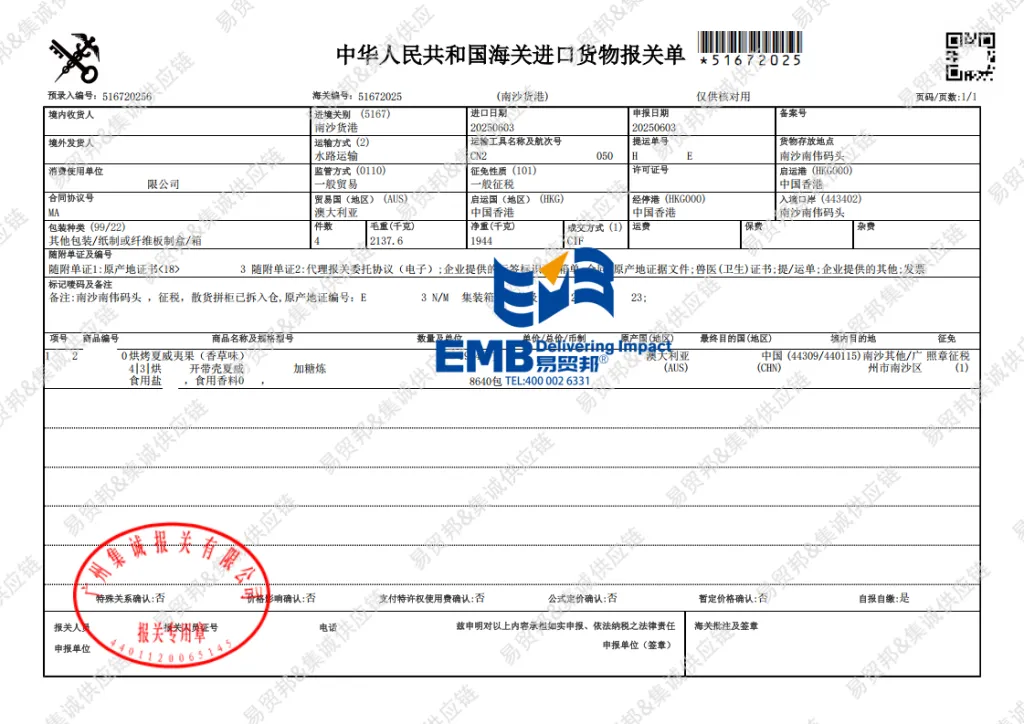 一、澳大利亚夏威夷果广州南沙港进口案例信息详情